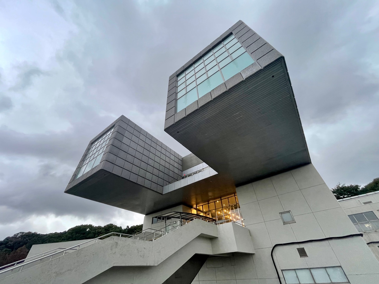 建築家・磯崎新さんによる設計。グリッドを基調にしたデザインと飛び出た2本の大砲のような建造物が印象的です。